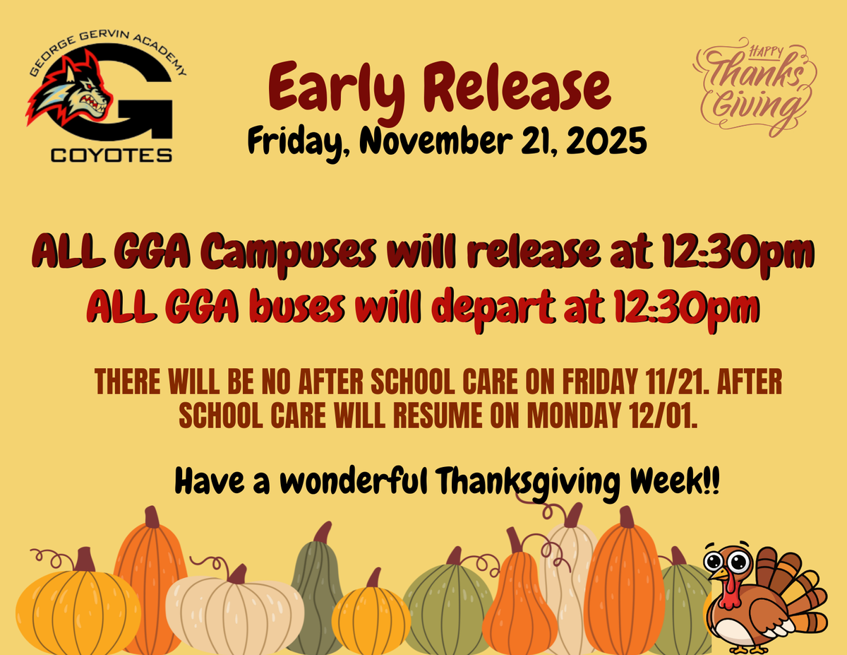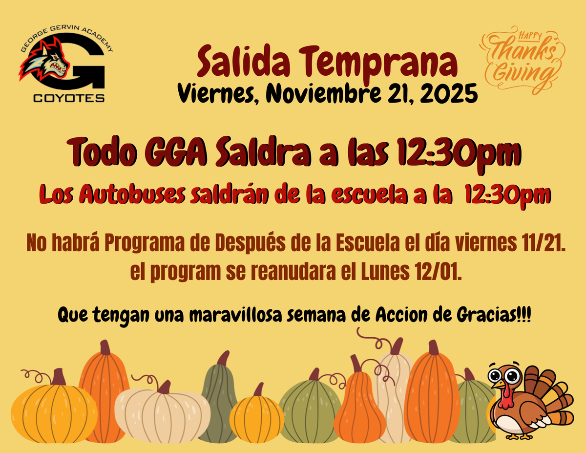 Les recordamos que el viernes 21 de noviembre a las 12:30 p. m. habrá salida temprana en TODOS los campus de GGA. Esto incluye: GGA-Main (Pre-K a 5.º), RJM (Pre-K a 5.º), GGA-Carmelite (Pre-K y Kinder), GGA Blanco y Secundaria (6.º a 12.º grado).